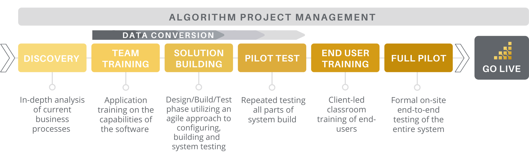 At Algorithm, we enjoy the implementation process. This is when relationships and trust are developed as we learn about you as an organization. We meet and discuss vital processes and what needs to be improved upon. It is the time to look at what could be and then build it. It really is exciting! With the right mindset and commitment, you will see the next era of your company’s success.