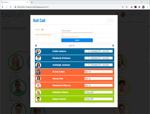 Roll Call shows who is clocked in, not clocked in, and anyone with time off.