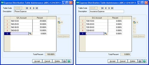 Next, setup the Expense Distribution Tables from Accounts Payable Setup, Expense Distribution Table Maintenance: