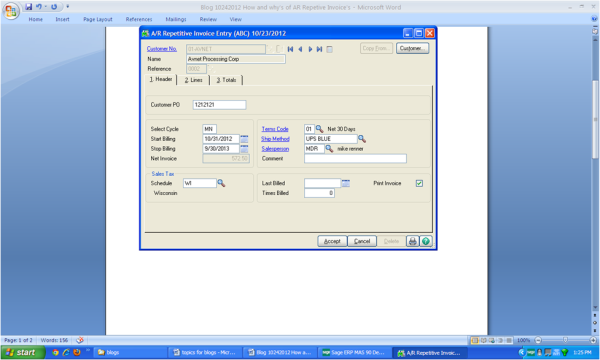 Question: Mike, we own Sage 100 ERP (formerly Sage MAS90), we would like to start using the Accounts Receivable Repetitive Invoice function, how does this work and what is it purpose?