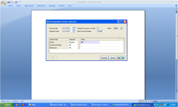 Enter in the parameters to run such as Cycle, Customer or Reference. Click the Proceed button which will create Invoices in Invoice Data Entry.