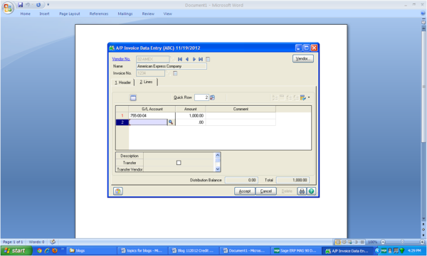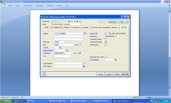 Question: Mike, we own Sage 100 ERP (formerly Sage MAS90), we use Credit Cards to process vendor invoices, how do we transfer Invoices to a Credit Card Vendor?