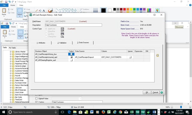 STEP 4 - Now click tab 3 Data Sources, and set to AR_CashReceiptsJournal_upd, Data Source should be AR_Cash ReceiptsDeposit and the Column set to UDF_DAILY_CUSTOMERS as should below. This will link to history. Then do the update steps.