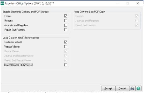 Step 3 - You will need to first setup the Paperless Office: Modules>Paperless Office>Setup>Paperless Office Options and make sure the Forms and Customer Viewer buttons are checked.
