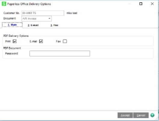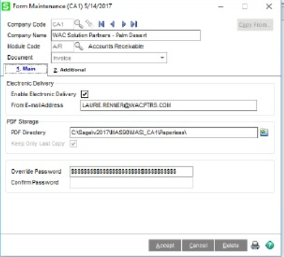 Step 5 - Setup the Form Maintenance for Accounts Receivable invoice: Modules>Paperless Office>Setup>Form Maintenance. Enable Electronic Delivery, add the From Email address, password and set the location of the PDF Directory.
