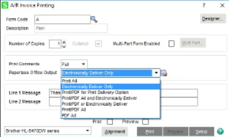Step 9 - Now when you select to print and Accounts Receivable invoice you will have options to Electronically Delivery Only, Print to PDF and Electronically Deliver and Print to PDF or Electronically Deliver. This will give you many options for printing. At this point you can test a couple sample invoices to may sure it all works.