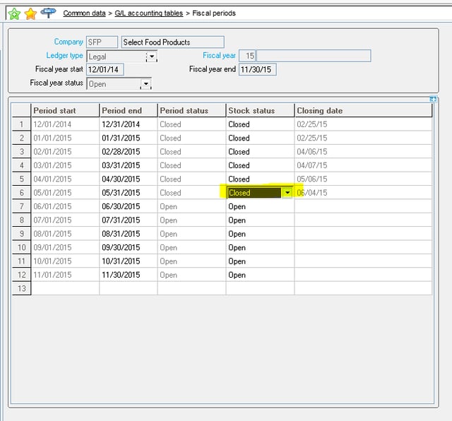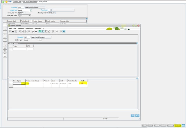 Open the Fiscal Periods function. Period can be closed by clicking the ‘Closing’ button at the bottom and then selecting the appropriate next period (tick the period).