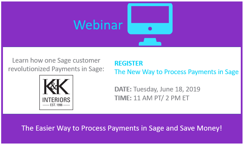 Register to attend this webinar and learn how one Sage user leveraged an integrated payment solution from APS Payments to help save their business time and money. Terry Wilhelm from K&K Interiors will share the challenges they ran into without an integrated solution, and the savings they've realized after switching to an integrated payment solution for Sage.